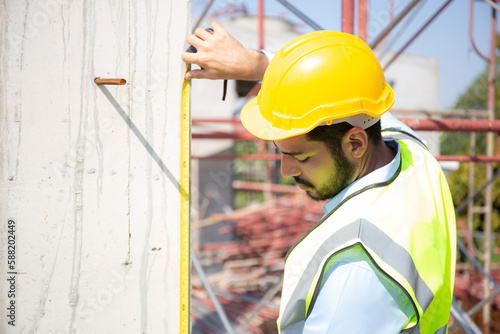 Engineer young man using tape measure for check and examining length of structure with professional at construction site, architect inspection and improvement infrastructure, industry concept.