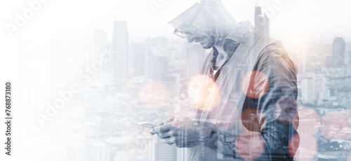 Engineering worker industry double exposure city, mobile smartphone technology concept, communication connectivity planning innovation, contractor technician, architect, city background blue banner.