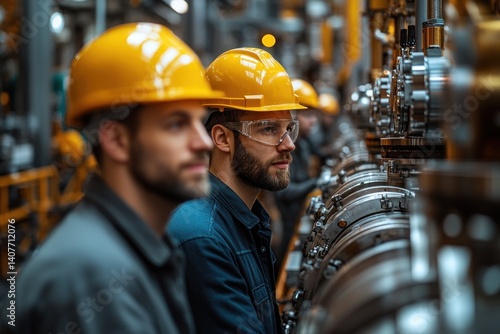 Engineers in Hard Hats Collaborating in an Industrial Factory Setting