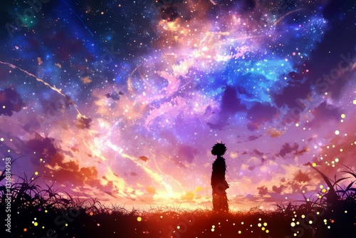 Enigmatic Silhouette of a Young Adventurer Against a Vast Cosmic Landscape Filled with Colorful Stars and Nebulas at Dusk