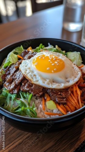 Enjoying a vibrant bowl of Korean bibimbap with vegetables, beef, and a fried egg in a serene Asian-inspired setting