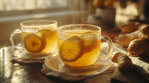 Enjoying Hot Lemon Ginger Drink in Glass Cups on Wooden Table