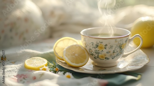 Enjoying Hot Lemon Tea with Slices on Floral Patterned Tablecloth
