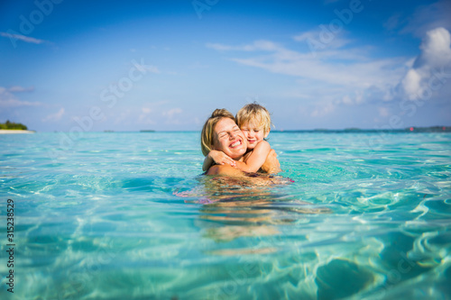Enthusiastic mother hugging son in tropical ocean
