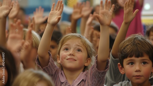 Enthusiastic students raising hands show active participation and create a dynamic learning environment.