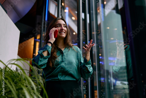 Entrepreneur in a modern office lobby talking on the phone