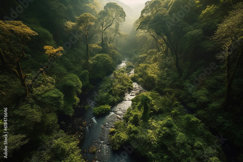 Environment, landscape and river with trees in forest for nature, sustainability and flora. Peace, ai generated and aerial view with water stream in countryside for foliage, paradise and wilderness