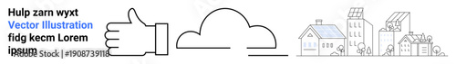 Environmental awareness, renewable energy, community development, sustainability, clean energy, eco-friendly living. A cloud with a thumbs-up and eco houses with solar panels. Environmental awareness