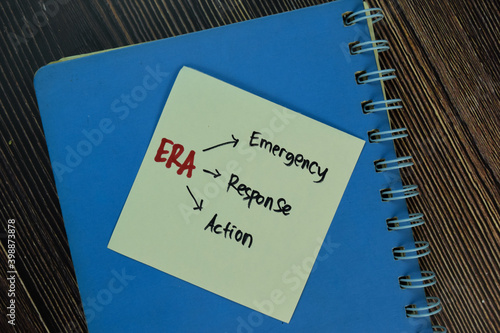 ERA - Emergency Response Action write on sticky notes isolated on Wooden Table.