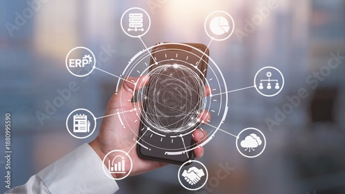 ERP icons show management, integration, and business process. ERP supports data management, ERP efficiency, and ERP organizational solutions. Gist
