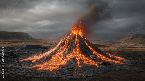 Erupting volcano spewing lava and smoke in a dramatic landscape.