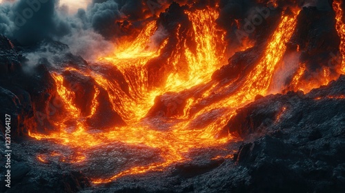 Eruption of an active volcano, lava flows, smoke and ash, natural disaster, geological phenomenon, extreme conditions, volcanic activity, heat, raging element, tectonic processes, natural force