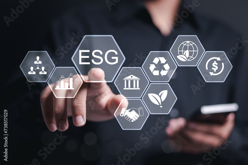 ESG environmental, social and governance. social business strategy, environment, business investment strategy. Person touching ESG icon for world sustainable environment concept.
