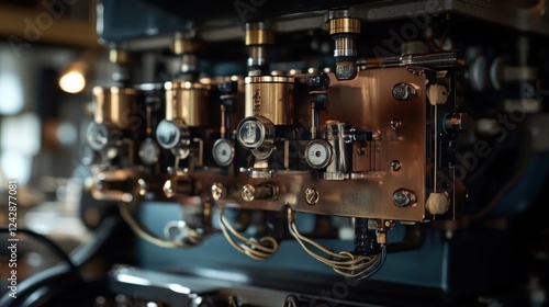 Espresso machine close-up, cafe interior, brass components, brewing process