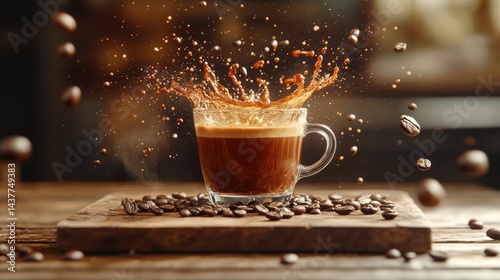 Espresso splash, cafe, beans, wood, background