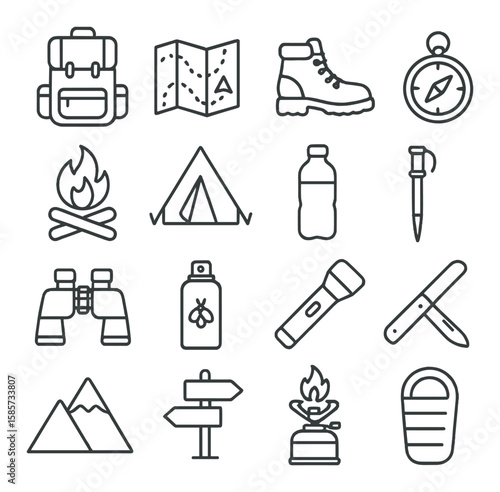 Essential camping icon collection. simple camping gear, map, tent, compass, boots, fire, sleeping bag, flashlight, knife, linear vector icons.