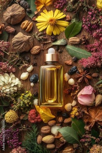 Essential oil nut in a bottle. Selective focus.