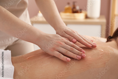 Esthetician applying cosmetic product for body wraps treatment onto woman's back in spa salon, closeup