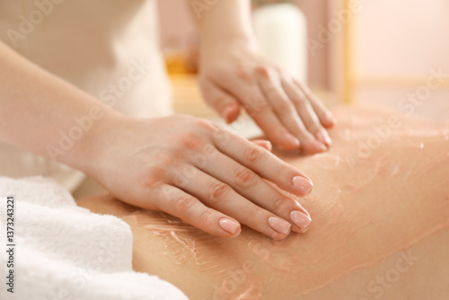 Esthetician applying cosmetic product for body wraps treatment onto woman's back in spa salon, closeup