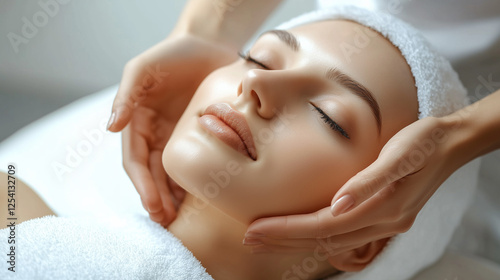 Esthetician Massaging with her hands a white caucasian woman Face skin in Bright Setting in a spa