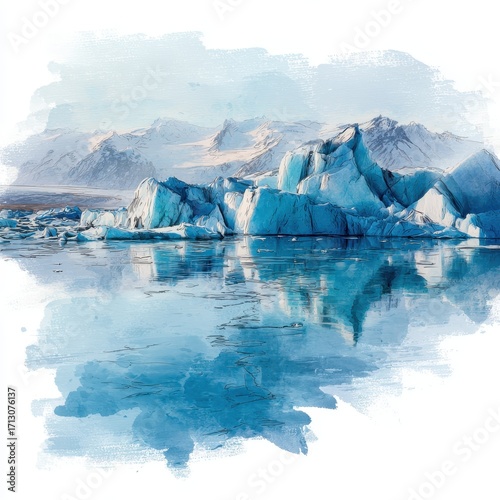 Ethereal Blue Icebergs Reflecting in a Glacial Lagoon, Rendered in a Soft Watercolor Style.