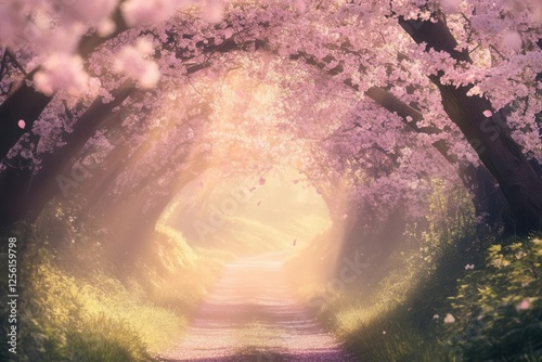 ethereal digital painting of winding cherry blossom tunnel, pink petals dancing in sunbeams, misty japanese landscape at dawn