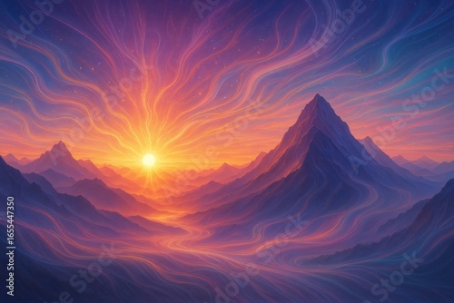Ethereal Digital Sunrise Over Mystical Mountain Range with Flowing Light Streams