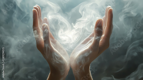 Ethereal hands against light smoky background with copy space. Magical Spell-Casting Hands. Illustration