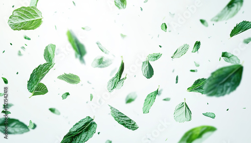 Ethereal Mint Leaves in Flight, Capturing the Essence of Freshness on a Pure White Background. A Flat Lay Presentation of Nature's Delicate Greens Drifting Downward