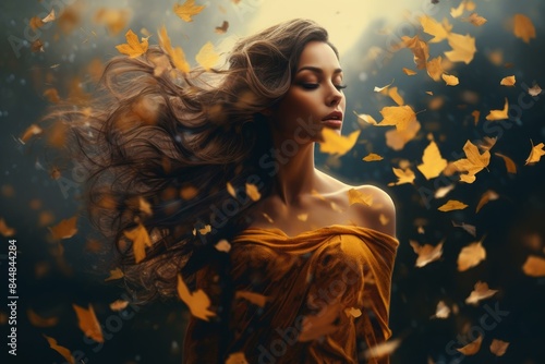Ethereal portrait of a woman draped in gold, her hair entwined with the dance of autumn leaves