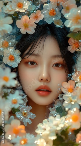 Ethereal Portrait of Woman Surrounded by Delicate White Flowers and Soft Floral Background