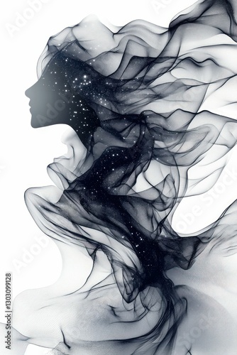 Ethereal woman silhouette, dark fabric, celestial sparkle.