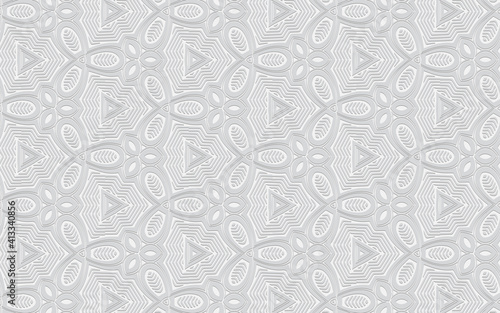 Ethnic convex volumetric wallpaper from a 3D pattern in the style of doodling. White embossed background from geometric shapes. Texture for presentations, websites.