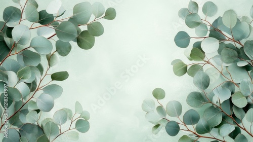 Eucalyptus leaves frame a light green background