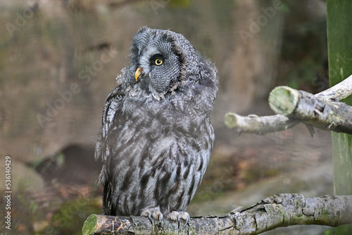 Eule Bartkauz (Strix nebulosa) sitzt auf einem Ast im Maus Wildpark Schweinfurt