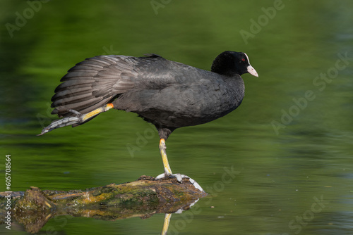 Eurasian coot (Fulica atra) stretching its wings on a river.