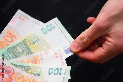Euro banknotes and Croatian Kuna. Concept showing Croatia's accession to the Eurozone