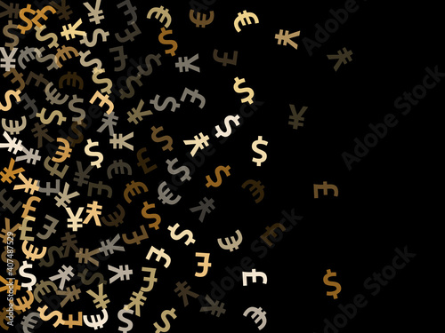 Euro dollar pound yen metallic symbols flying money vector background. Business backdrop. Currency