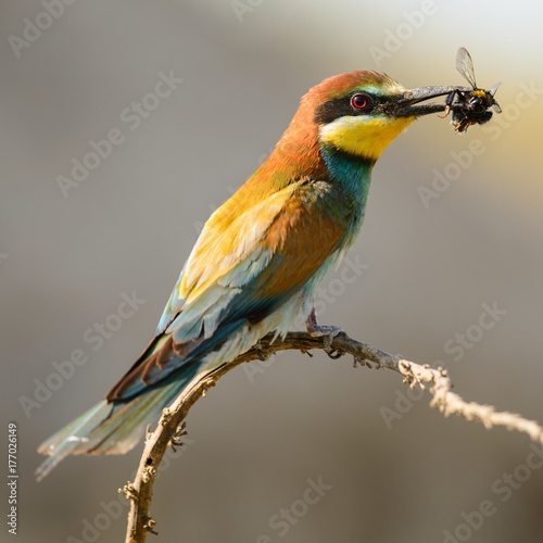 European bee-eater sitting on a branch with a bee in its beak
