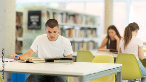European guy is sitting at a table, reading a book and making notes in a notebook, he is preparing to enter the university in the new academic year. Students study in the library