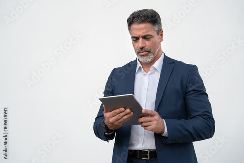European Hispanic successful mature adult professional business man in formal suit working on device. Indian senior businessman ceo holding digital tablet using application isolated, white background