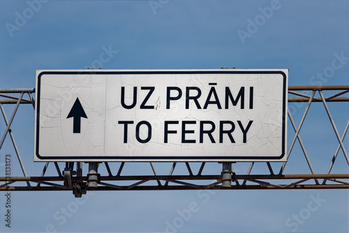 European White Direction Sign Indicating Way to Ferry with Arrow Forward