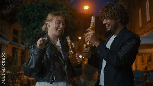 European woman and Arabian Indian Latino man open bottle of beer cider clink glasses walk street outside city evening friends drinking smiling weekend multiracial couple celebrate happy together enjoy