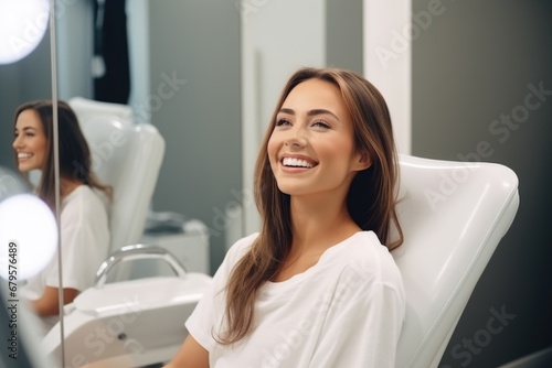 European woman smiling happily while sitting in medical chair at dental clinic. AI Generated