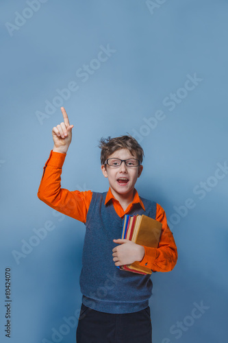 European-looking boy of ten years in glasses thumbs up, the