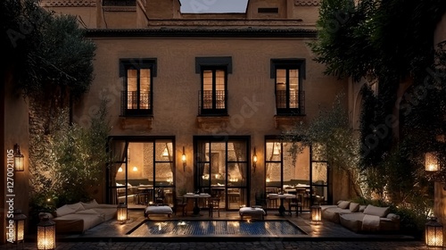 Evening view of a courtyard with pool, building, and outdoor seating.
