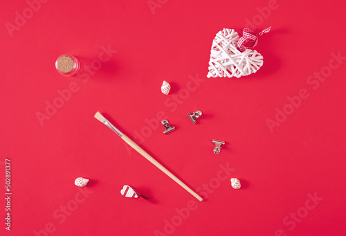 Everyday objects lay down on pastel red background. Minimal horizontal flat lay composition, decorative design concept