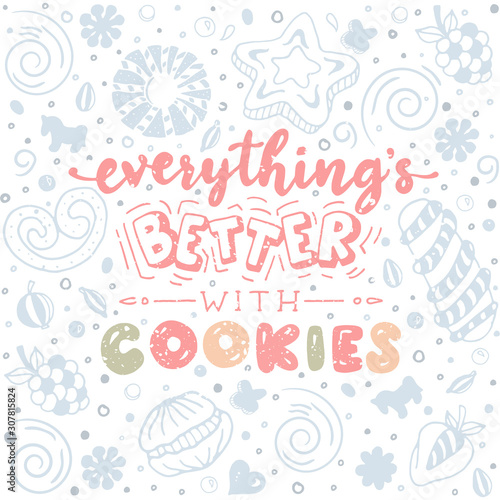 Everything’s better with cookies. Funny lettering quote in pastel colors. Hand drawn text for card, poster, banner, t-shirt or packaging design.