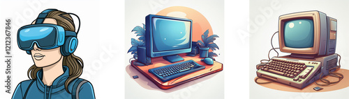 Evolution of computing: A woman using VR, a modern desktop, and a vintage computer. Showcasing technological advancements.