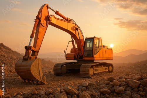 Excavator at Sunset Over Rocky Landscape with Dramatic Sky